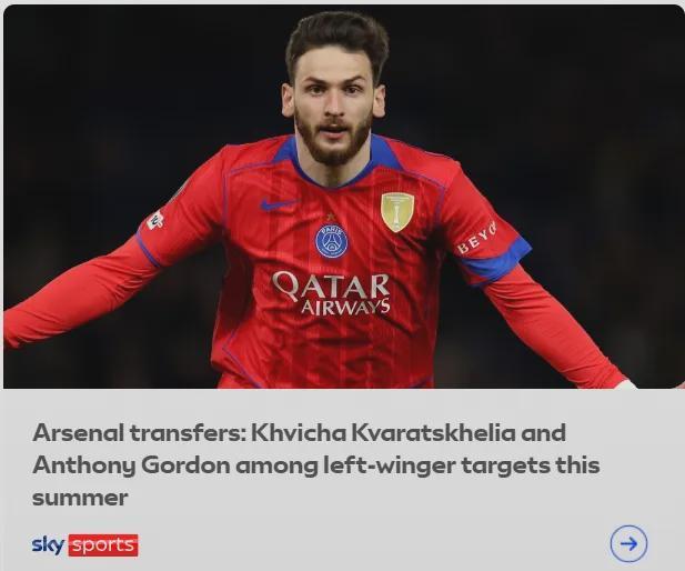 天空体育记者LT消息,阿森纳正寻求在今夏签下一名左边锋,克瓦拉茨赫利亚以及安东尼-戈登都是他们密切关注的目标。
